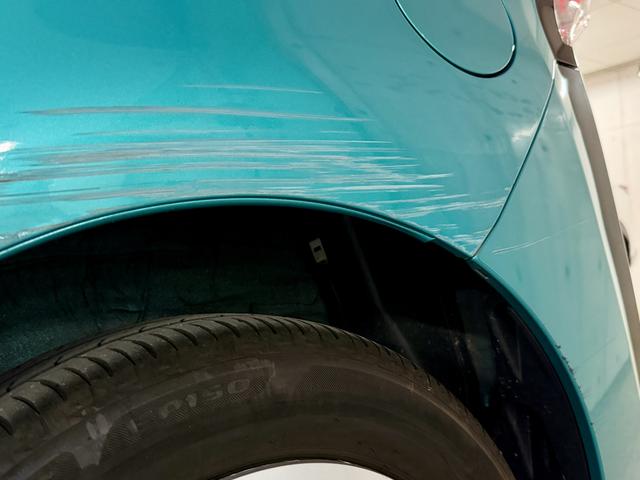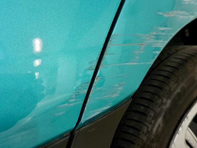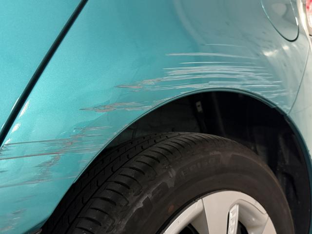 ・購入した年に自宅の屋外駐車場で、低速でバックした際に門柱に軽く接触し、左後ろフェンダー〜リアバンパー付近に擦り傷があります。走行中の事故ではなく、低速での接触による外装の擦り傷のみで、走行や安全装備への影響はありません。凹みはほとんどなく、現在まで問題なく使用してきました。状態が分かるよう写真を掲載していますのでご確認ください。